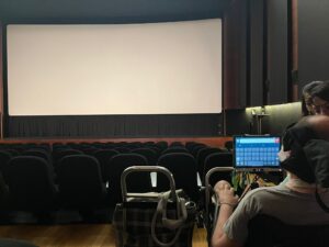 En primer lugar, la accesibilidad del cine. Algo que, por suerte, está realizado cada vez de mejor forma, especialmente en las infraestructuras e instalaciones de nueva construcción. Luego, la sala debe tener una buena ubicación de la zona reservada para las sillas de ruedas, ya que, la mayoría de las salas que se hicieron accesibles tras su construcción, únicamente habilitan la primera fila delante de las primeras butacas. Si para cualquier persona sana ya es incómodo, imaginad para nosotros. Y, por último, y no por ello menos importante, nuestro cuidador o familiar debe tener visión y acceso directo a nosotros, sin molestar al resto de espectadores. Y un extra para los que estamos traqueotomizados, que tenemos que salir de casa con un carro para llevar todas las máquinas que podemos tener que utilizar. En este caso, necesitamos un espacio adicional para poder «aparcar» el carro donde no moleste.